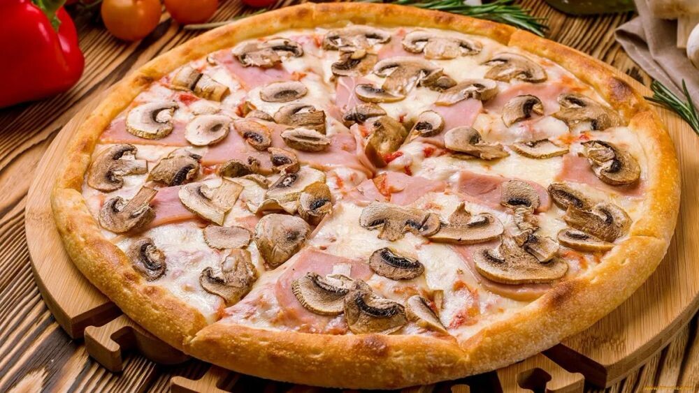 Классическая итальянская пицца на тонком тесте с томатным соусом, шампиньонами, ветчиной и тягучей моцареллой.