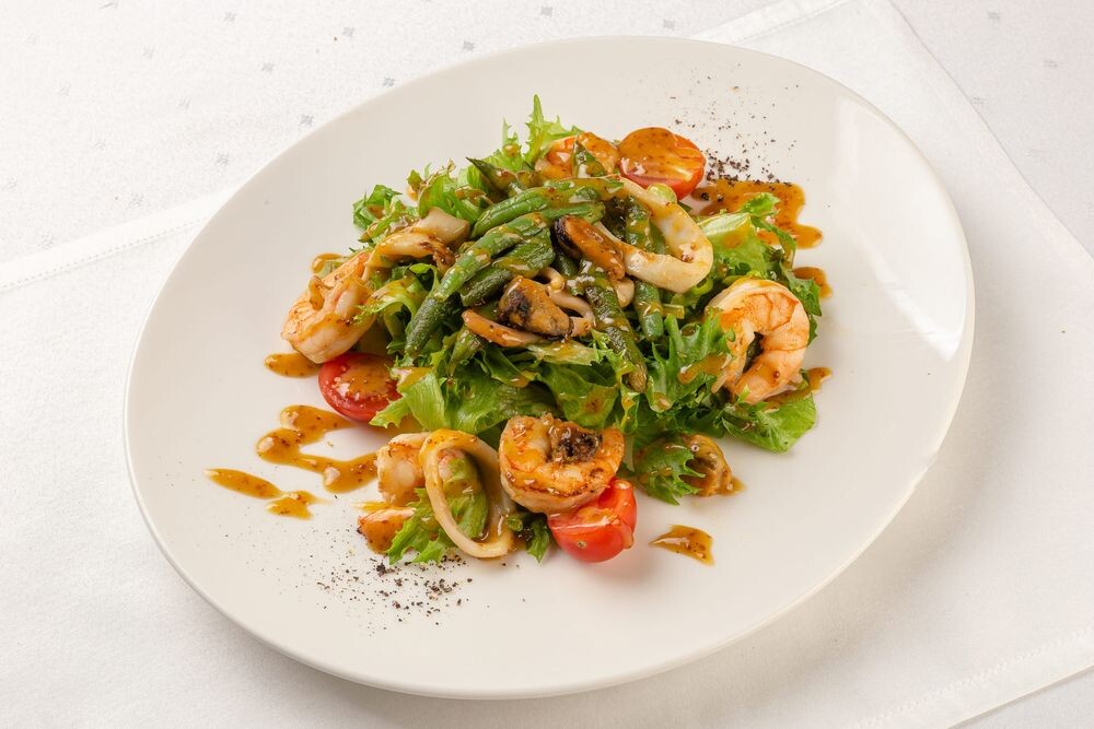 Блюдо, которое сочетает нежные нотки морепродуктов и яркий вкус соуса, приготовленного на основе сливок, красного соуса с добавлением песто и бальзамика. Подаётся на подушке из айсберга.