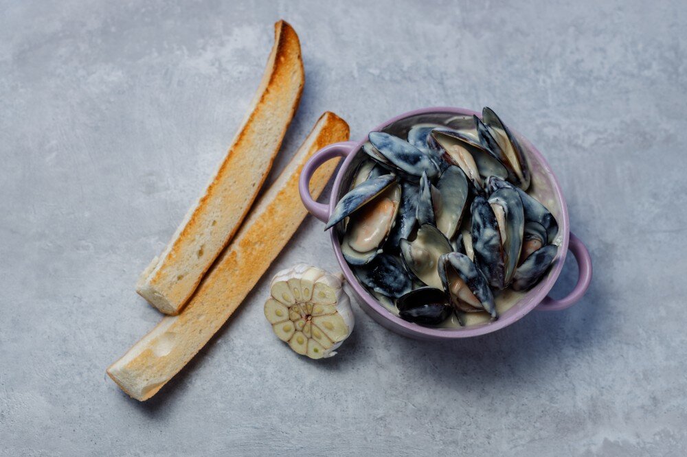 Нежные мидии, томлённые в густом сливочно-чесночном соусе, с аппетитными гренками и лимоном для придания лёгкой кислинки