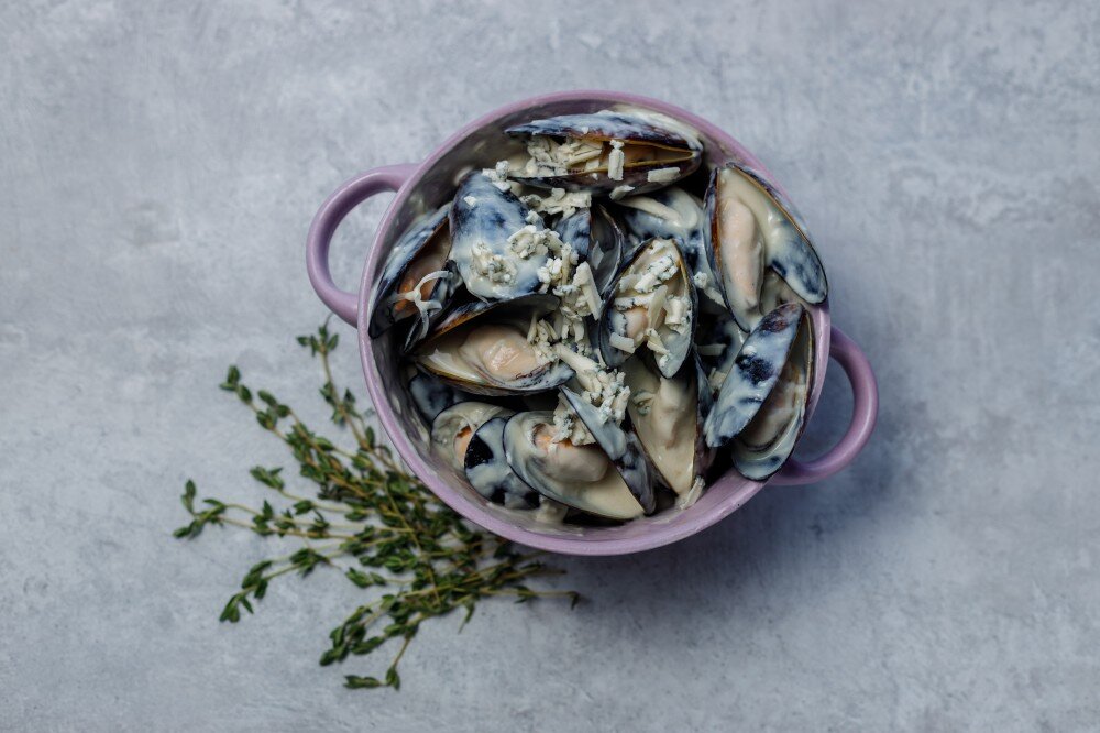 Мидии в соусе дорблю — это изысканное блюдо из мидий, тушенных в сливках с сыром дорблю и чесноком, подаются с ломтиками хрустящей чиабатты. Идеальный выбор для ценителей морепродуктов и сыра.