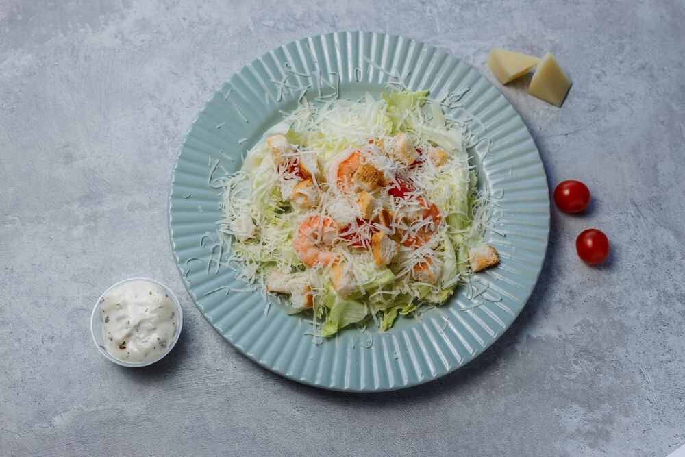 Хрустящие листья салата, нежные креветки, ароматный сыр и пикантная заправка создают гармоничное сочетание вкусов.